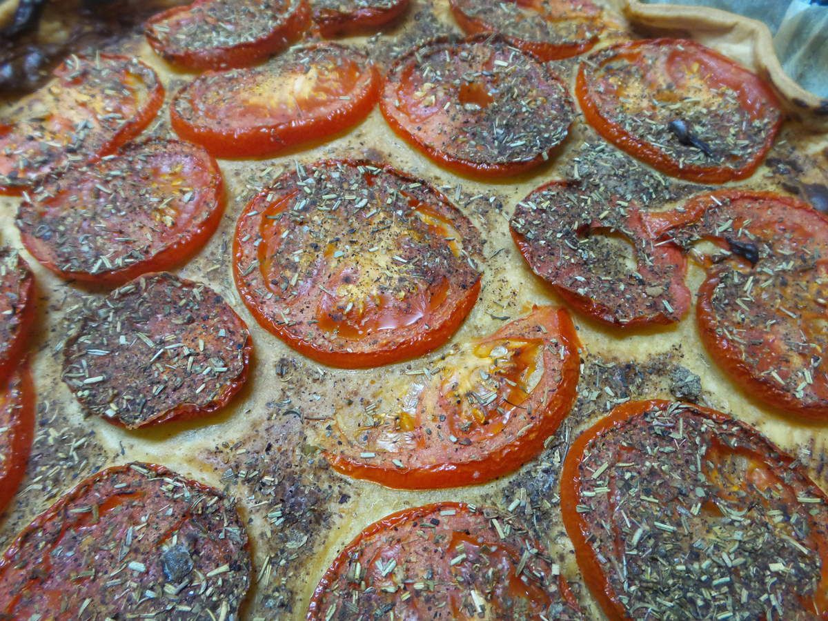 -Laver et couper vos tomates une à une en tranches ni trop fines ni trop épaisses et disposer les sur la pâte, saupoudrer d'herbe de provence ou du mélange maison (plus goûteux) et enfourner une 20aine de minutes (surveiller la cuisson)